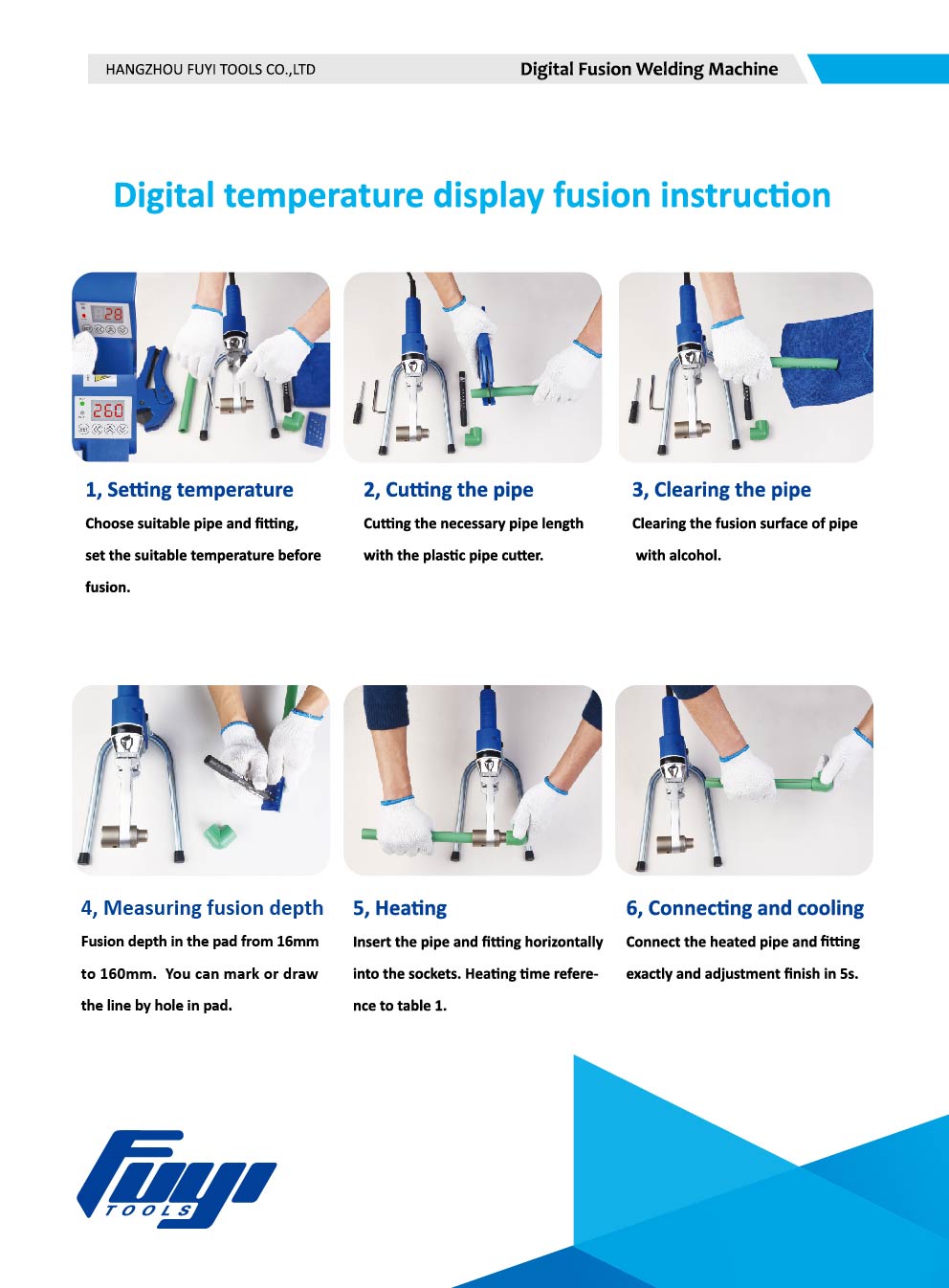 Kako koristiti digitalni aparat za zavarivanje taljenjem 1. Postavljanje temperature Odaberite prikladnu cijev i priključke, namjestite prikladnu temperaturu 2. Rezanje cijevi Rezanje potrebne duljine cijevi rezačem plastičnih cijevi. 3. Čišćenje cijevi Čišćenje fuzijske površine cijevi alkoholom 4. Mjerenje dubine fuzije Dubina fuzije u jastučiću od 16 mm do 160 mm. Crtu možete označiti ili povući rupom u jastučiću. 5. Grijanje Umetnite cijev i spojnicu vodoravno u utičnice. Referenca vremena grijanja prema knjižici s uputama u kompletu. 6. Spajanje i hlađenje Točno spojite grijanu cijev i fiting i podesite završetak u 5 s.